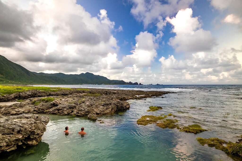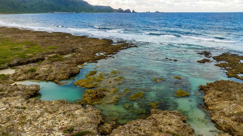 Yeyin Cold Spring creation was by the nearby underground river which breaks out here to form a cold spring. The surrounding reefs retain the cold spring and form a natural gradient pool. With the continuous inflow of fresh water, even though the reefs are quite close to the sea, patches of green grass grow on them. With this sight in the background, the coast, sky, and distant mountains together make a picturesque scenery.