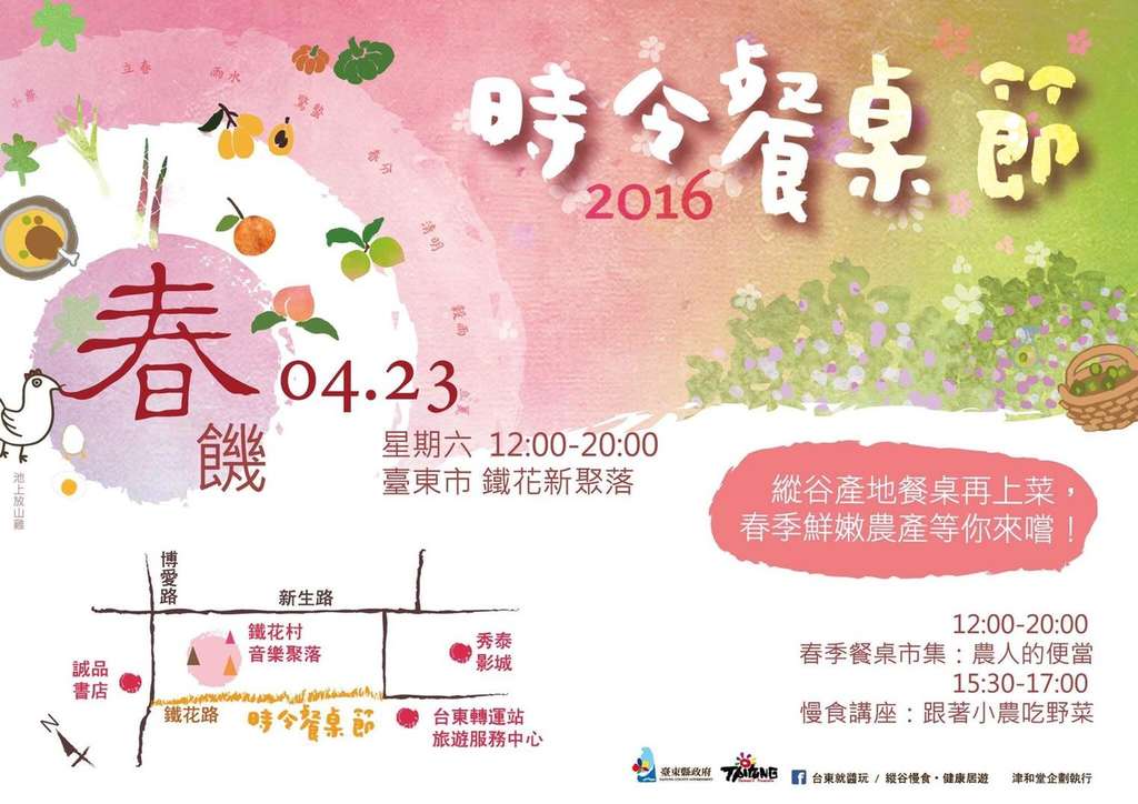 "Taitung Slow Food Festival" is coming to Tie Hua Village on Apri. 23th! The first spring market will take place from 12:00pm that you could taste agricultural products from local farmer. on 3:30pm, therer will be a talk from local farmer give an introduction to Taitung local vegetables, along with fun DIY activities! All are waiting for you to enjoy!