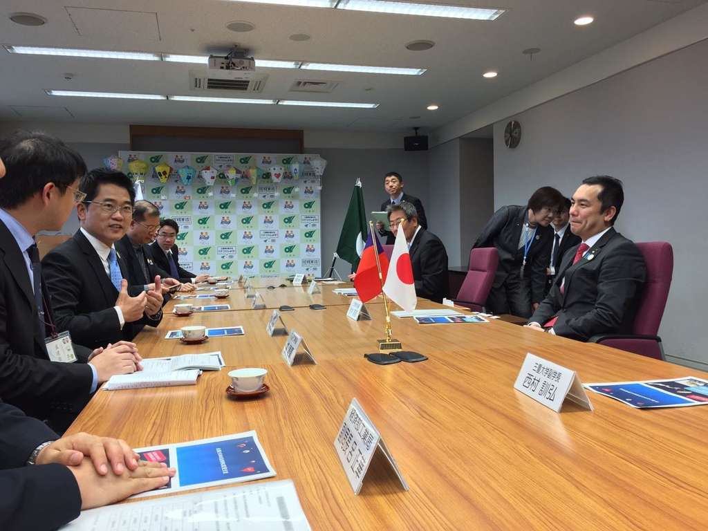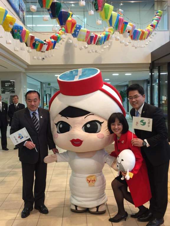 Magistrate Justin Huang brought a team to Mie Prefecture, Japan on March 8 and 9 to meet for the second time with Prefectural Governor Eikei Suzuki, Iga City Mayor Okamoto Sakae, and Shima City Mayor Hidekazu Oguchi. This meeting was arranged to discuss details on cooperative exchange between Taitung and Japan as stipulated in an MOU signed in January. Magistrate Huang and his team went to Mie Prefecture Hall in Tsu City as well as the city halls in Iga and Shima Cities. They were surprised to see the 300 model hot air balloons they had given the Japanese teams in January hanging in the lobbies of those buildings after having been decorated by local schoolchildren. In addition, the Iga and Shima City Hall entrances had spaces set up do display items from Taitung such as its mascot, indigenous cultural and creation products, and travel brochures, allowing locals to get to know Taitung and gain interest in traveling there.