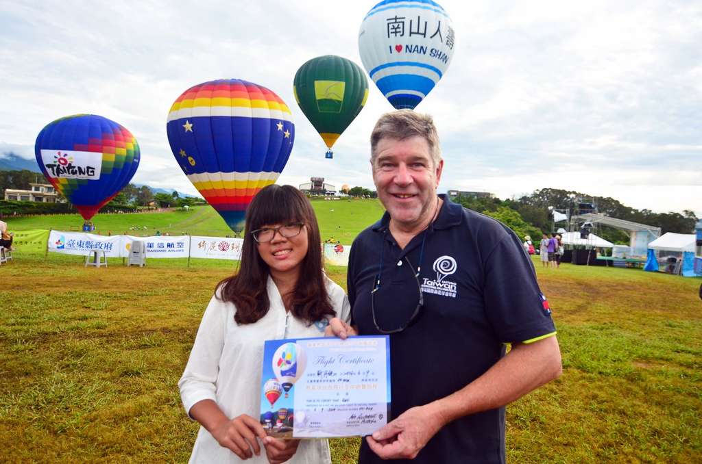 Deni is getting ready to finish her courses at Feng Chia University as an exchange student in two weeks. On 6/5 she came to Taitung from Taichung by train and arrived at the Luye Gaotai in the early morning on 6/6. This is her 3rd time to Taitung. She has longed for experiencing the hot air balloons. When she arrived at the venue of the event, she was the first and only one in line to buy the ticket for tethering ride. Even alone with fear, she waited and waited until the day was dawning. However, the weather seemed to test her patience and make her wait for 2 days. She tried to save her money to make the last try. She prayed sincerely but the weather still failed her. While she cried and almost gave up on the hot air balloon tethering, one of our pilot from Australia, Peter Dutneall, heard about her story and said that he would like to invite her to fly with him as VIP the next morning. The good will was approved by the event organizer. One owner of a B & B provided a room for her to stay for one more night. A taxi driver was willing to give her a free ride to train station. She said the most beautiful scenery in Taitung is the hospitality and kindness of the people here. She promised to come back to visit Taitung every year.