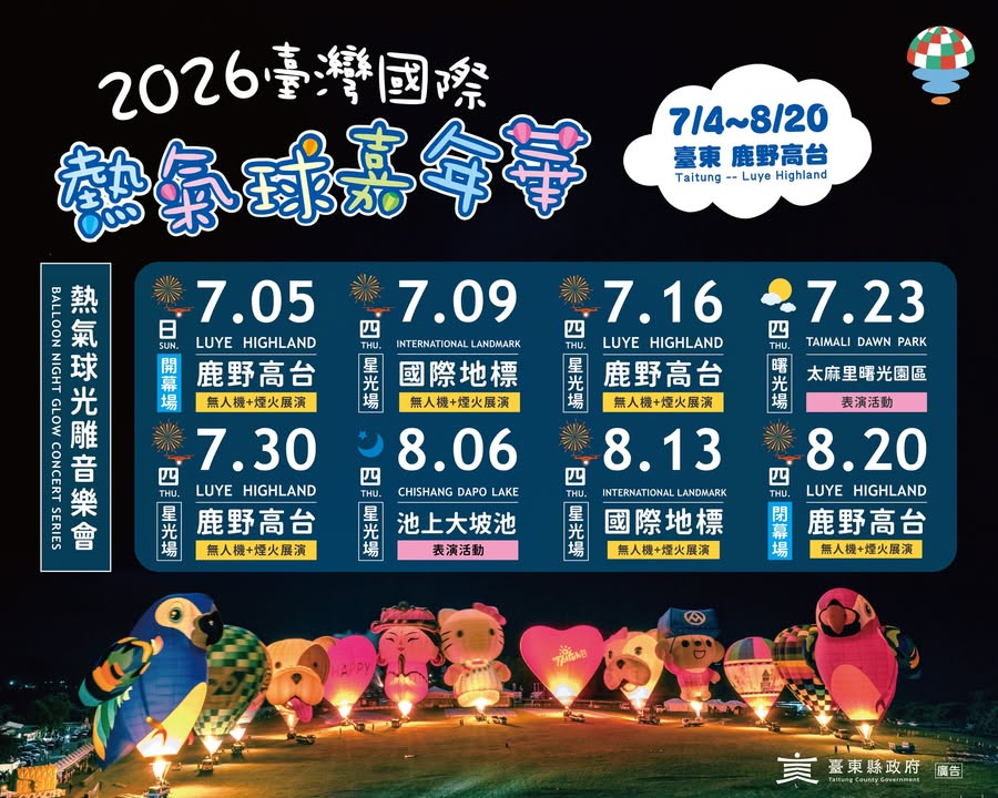 齁!这不是愚人节玩笑!知道大家的期待值已经破表 小编整理𝟯个重点,帮球迷和粉丝解答!!! 造型热气球/追球日志 ◍IP主题造型球:正在努力生产中!预计在活动期间,於鹿野高台正式跟大家见面! ◍追球日志:持续规划中!有最新消息小编会尽速公告! 热气球国际记者会 ◍ 𝟰/𝟭𝟭 (六) 𝟭𝟵:𝟬𝟬 将於台东县立体育场举办,详细活动流程敬请锁定粉丝专页 光雕音乐会/无人机展演资讯 ◍无人机展演、光雕音乐会:场次将於𝟰/𝟭𝟭 (六) 国际记者会中一并公告。 ◍表演卡司资讯:众所期待的卡司名单正紧锣密鼓敲定中,敬请期待! 小编提醒:请大家持续追踪官方专页,抢先掌握第一手情报🫡 𝟮𝟬𝟮𝟲 台湾国际热气球嘉年华 ▸𝟳月𝟰日-𝟴月𝟮𝟬日|鹿野高台 ▸主办单位保有最终修改、解释及取消本活动之权利 - 2026-03-31