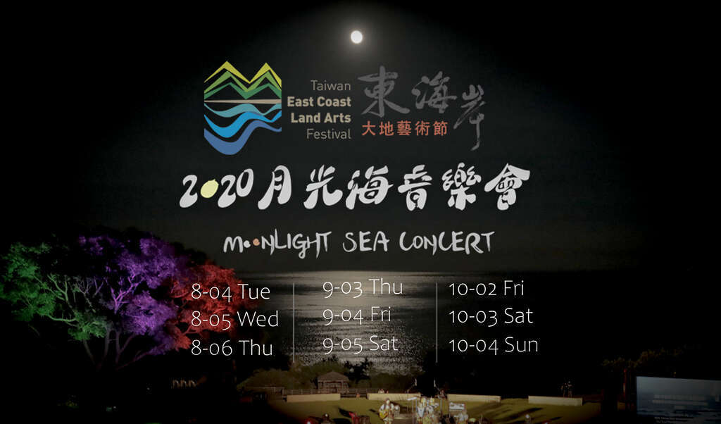「月光.海音乐会」主要以自然景观做为舞台背景,藉由月升日落浪起潮退等自然现象的动态展演,具体而微隐喻了大地艺术节想要表达的闲暇哲学与东海岸生活的美学风格。配合大地艺术节及结合在地文创品展售市集,於每月接近满月之日,搭配东海岸独有的月光海美景,在依山傍海的大自然空间,欣赏国内外音乐创作人精彩的演出。活动时间 2020-08-04~2020-10-04