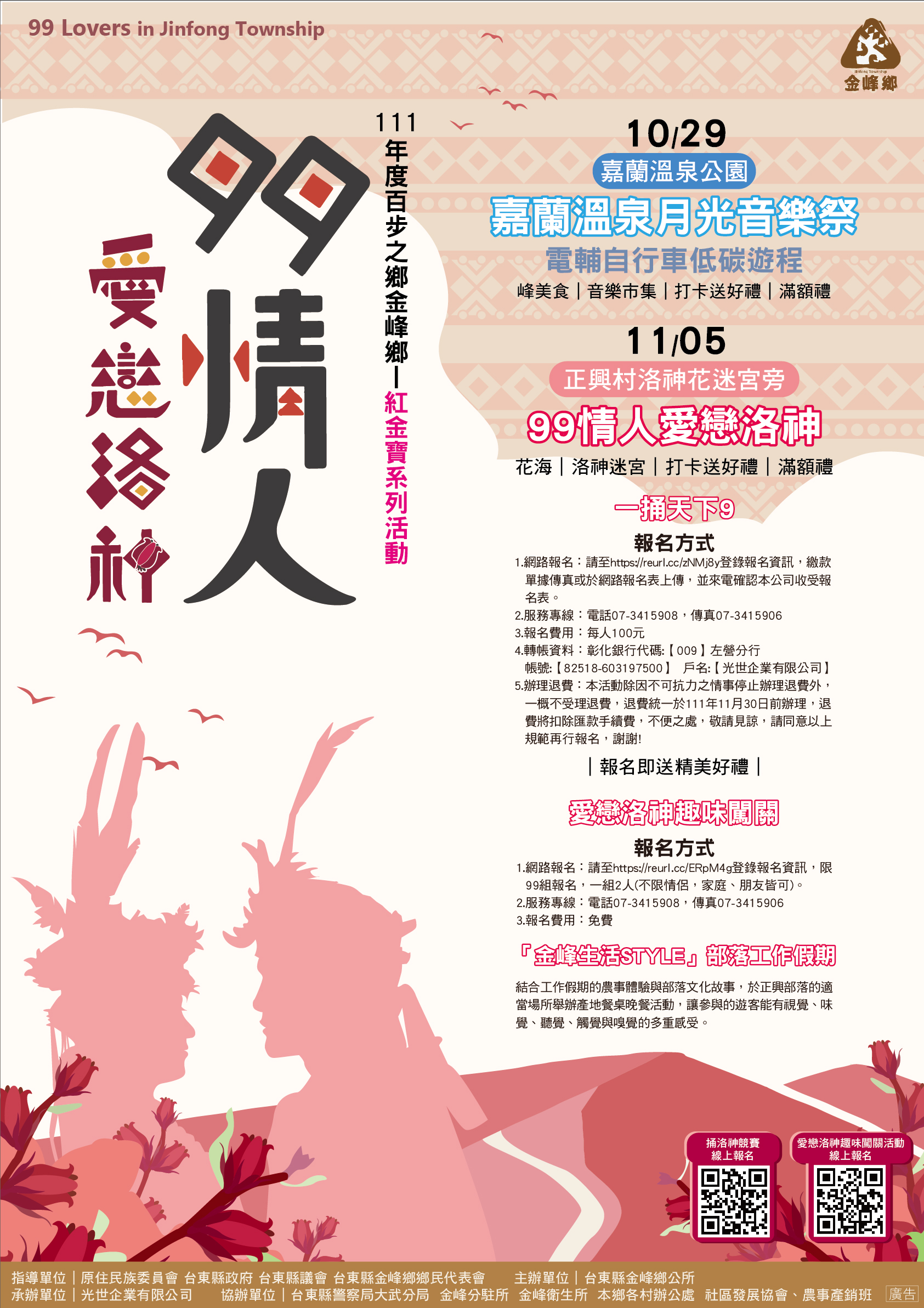 洛神花除了具有极高的营养价值之外,也代表金峰乡「红金宝」的宝,为金峰乡排湾族的「红宝石」,期望为金峰乡带来宁静,希望,信仰。本次活动预计号召99对情侣,一起来体验洛神趣味活动,希望藉由洛神花的带有希望含义,祝福前来体验的99对情侣,并留下深刻的情感回忆。