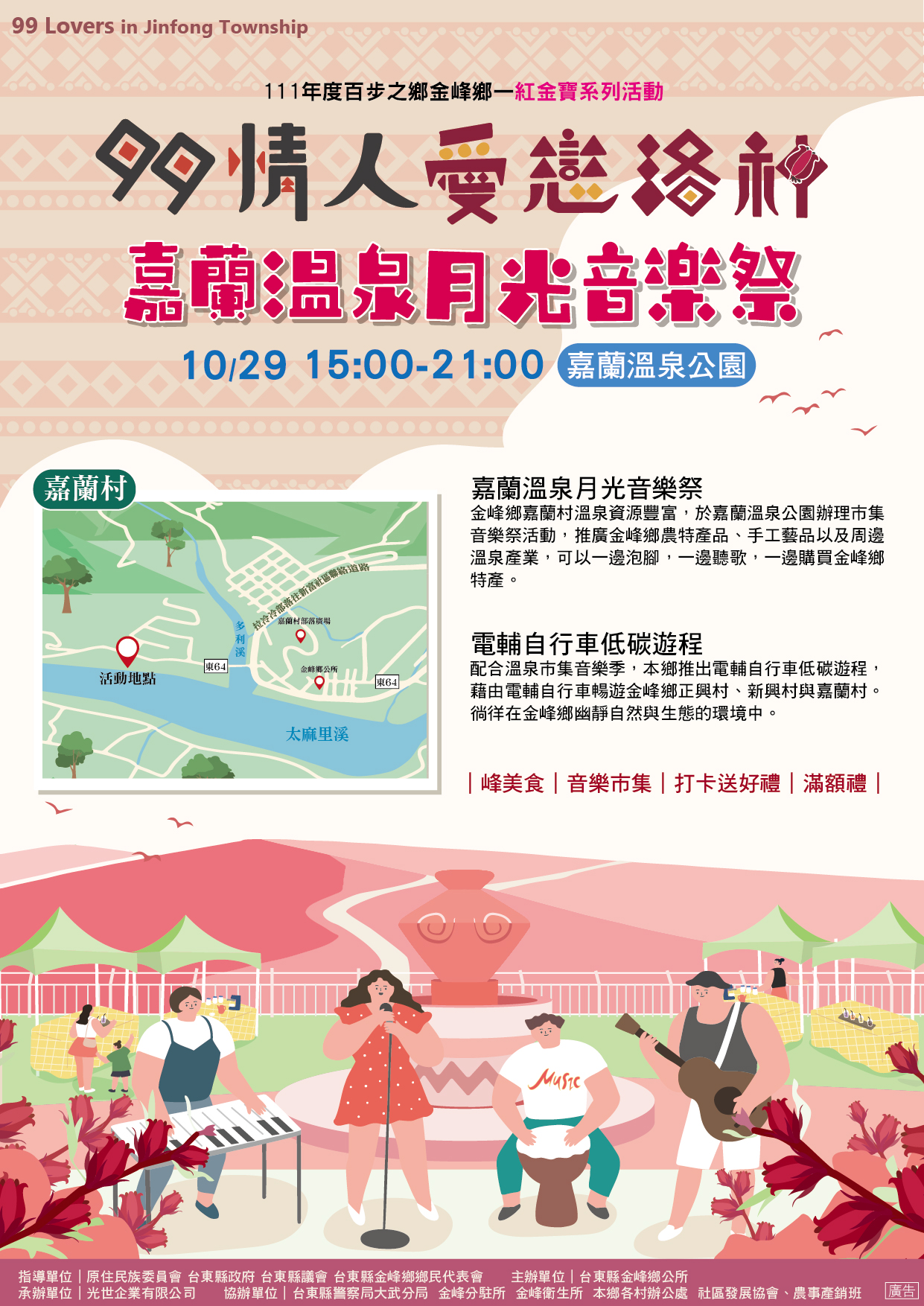金峰乡嘉兰村温泉资源丰富,於嘉兰温泉公园办理月光音乐祭活动,推广金峰乡农特产品、手工艺品以及周边温泉产业,可以一边泡脚,一边听歌,一边观赏星空,一边购买金峰乡特产。