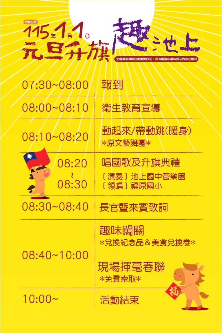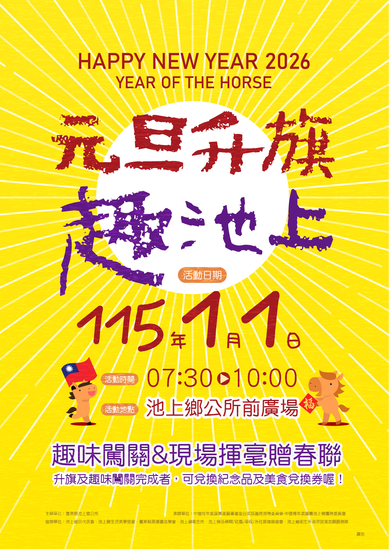 更新日期:2025-12-31發佈單位:台东县政府275分享到FacebookTweet分享到微博LINE 给好友 活动时间 2026-01-01活动地点 台湾台东县池上乡池上乡公所前广场 各活动时间以主办单位最新公告为主 加入Google行事曆 讯息内容趣味闯关和现场挥毫赠春联 升旗及趣味闯关完成者,可兑换纪念品及美食兑换券 活动时间|115年1月1日(四) 07:30-10:00 活动地点|池上乡公所前广场相关连结台东县池上乡公所|FB相关照片