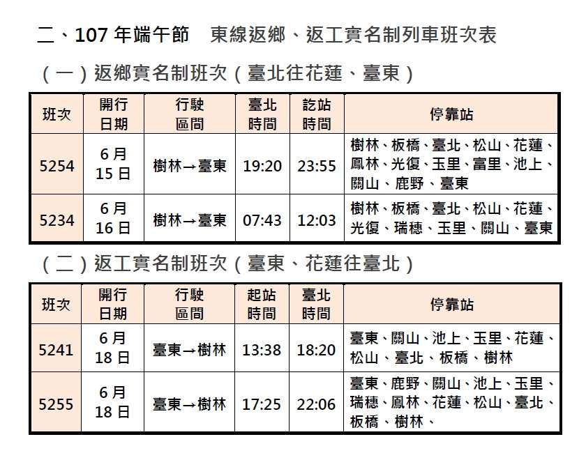 台铁为配合『107年端午节连续假期』疏运旅客需要,指定日期加开临时旅客列车如下: