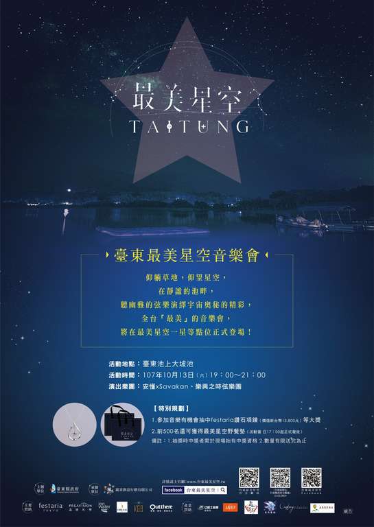今年首度举办的【台东最美星空音乐会】也将於10/13(六)晚上七点,於刚选出来的一星等点位-池上乡大坡池举办,邀请到知名世界级管弦乐团-乐兴之时,以及曾获两届铁花村乐团比赛第一名、来自台东卑南族建和部落的安懂 x SAVAKAN乐团现场演出;当天活动全部免费入场!来参与的民众不仅可参加抽奖活动,更有机会抽中由festaria Tokyo独家赞助总价值超过两万元的超美钻石项链,前500名抵达现场的民众更可免费获得活动独家特制的最美星空野餐垫!诚挚邀请所有民众踊跃参加,一起享受徜徉在最美星空下欣赏音乐的乐趣