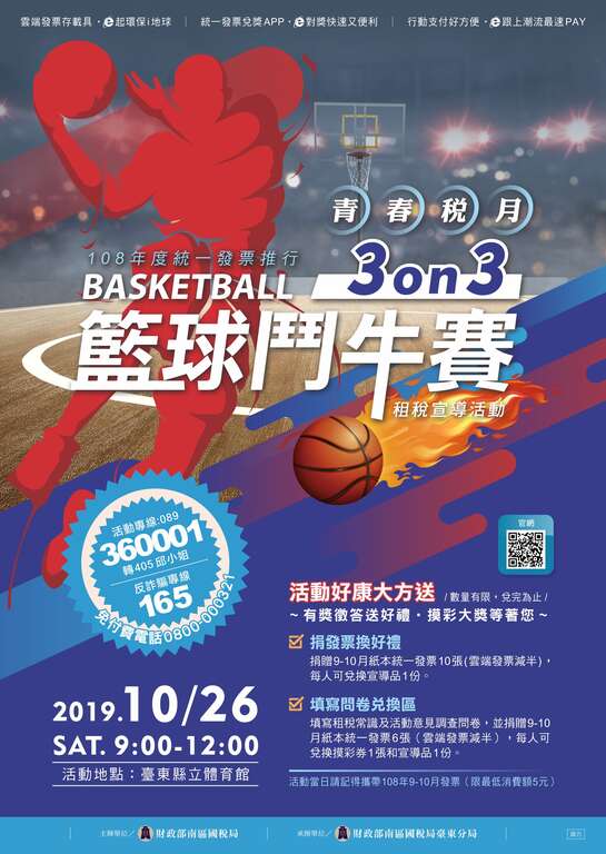 将於台东县立体育馆举办「青春税月~3对3篮球斗牛赛」宣导活动,