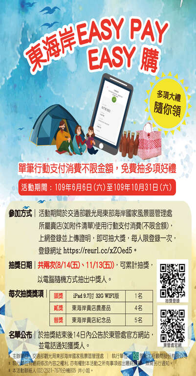 该活动自109年6月6日起至109年10月31日期间,只要在东管处所属游憩区内可使用行动支付之卖店,使用行动支付消费,不限金额,上网登录并上传证明即可抽大奖(网址:https://reurl.cc/xZOed5)。