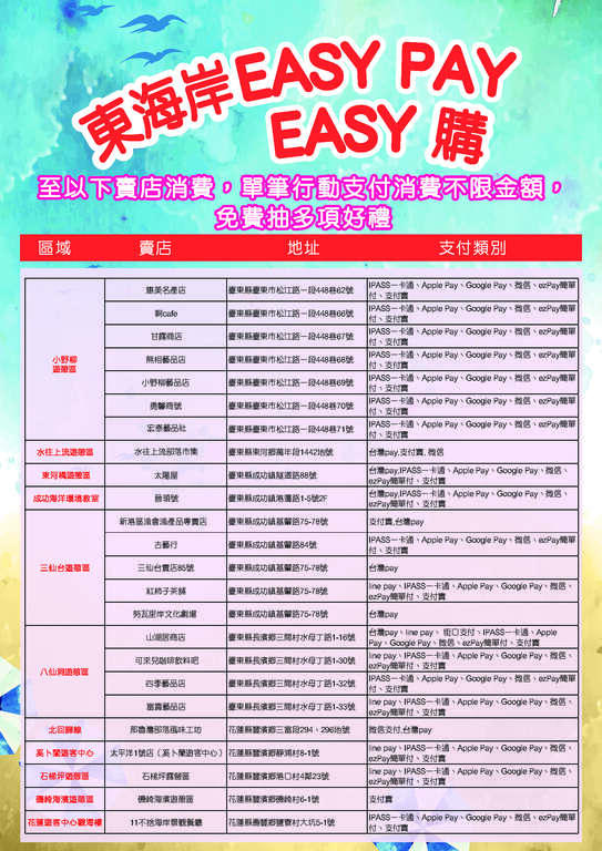 为了让游客到东部海岸旅游时消费购物更方便,交通部观光局东部海岸国家风景区管理处(以下简称东管处)特别针对景区卖店进行行动支付辅导,并为推广行动支付,以及回馈到此旅游消费的游客,办理「东海岸EASY PAY EASY 购」活动。