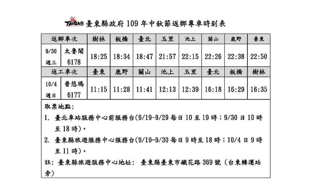 台东县政府中秋节返乡(返工)专车自即日起至109年9月30日17:00截止开放第2次订票