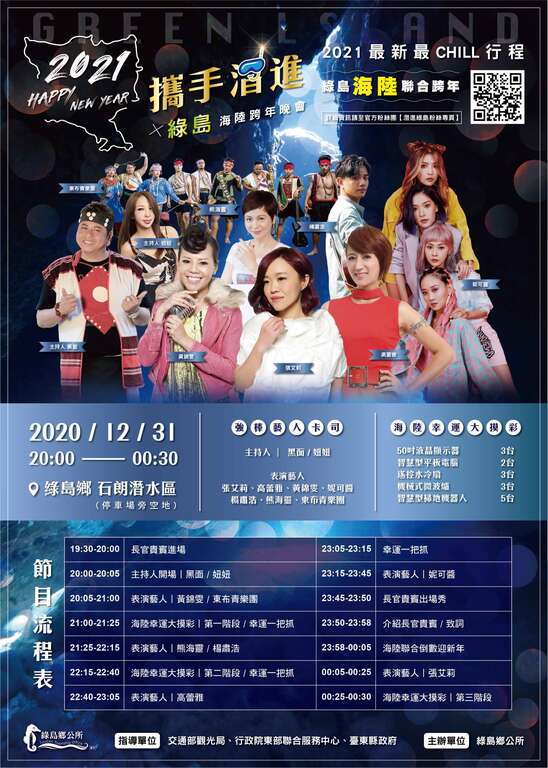 跨年,代表着向旧一年的道别,代表着向新一年的期待,是人们聚集相欢的一夜,是大家满怀期待的一刻,而本次【2021携手潜进-绿岛海陆联合跨年活动,举办全台唯一海陆联合跨年晚会,并以【陆地(演唱会型态),及【海底-水肺海底夜潜】之方式,做为本活动的最大亮点,期望绿岛在新的一年能一起【携手潜进】。