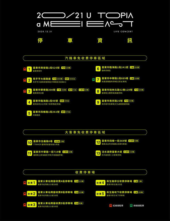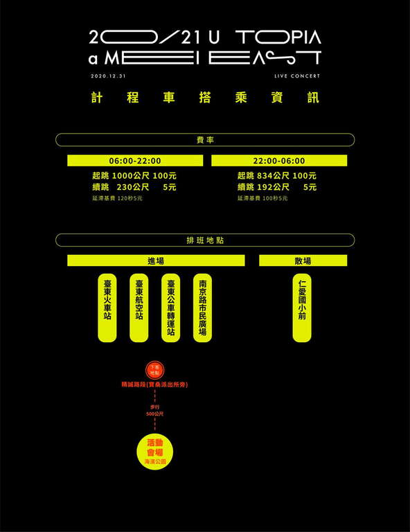四、12月31日搭乘计程车:可由台东火车站、台东航空站、台东公车转运站、南京路市民广场活动排班区搭乘计程车前往会场;散场统一於仁爱国小前搭车。