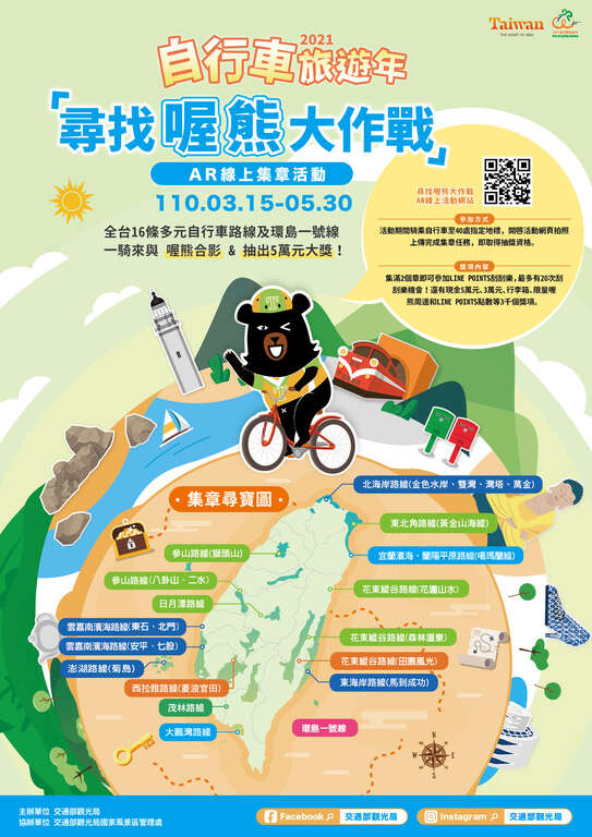 交通部观光署为推广「2021自行车旅游年」,近年除了优化自行车环岛路网软硬体设施与安全改善外,也持续推广在地化、国际化的自行车深度旅游防疫期间为鼓励民众走出户外,推出实地单车旅游结合线上AR游戏的「寻找喔熊大作战」集章活动,全台共计有40个打卡集章点,将送出LINE POINTS点数、喔熊限量周边商品及行李箱等3千多个奖项,还有机会抽中5万元及3万元现金!