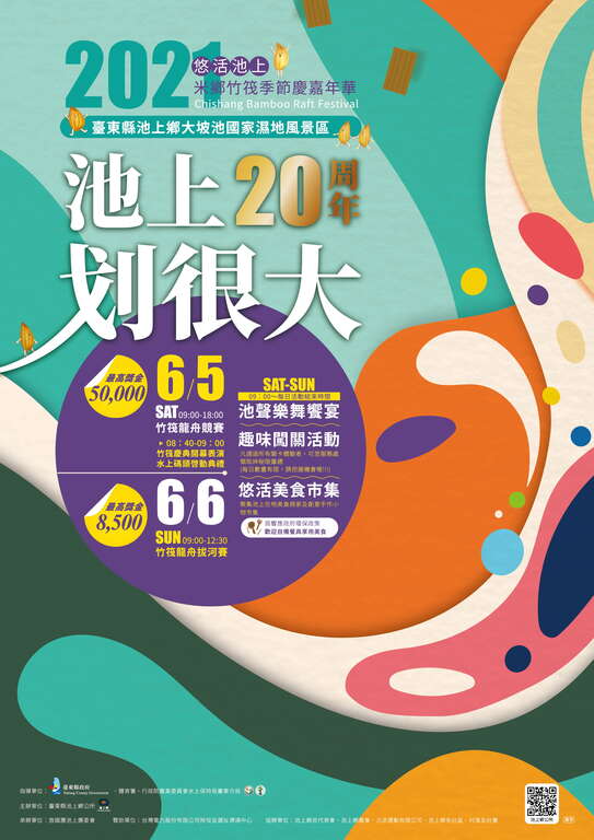 「2021悠活池上米乡竹筏季系列活动」今(110)年迈入20周年,订於110年6月5日(星期六)至6月6日(星期日)在池上乡大坡池国家湿地风景区举办,为庆祝20周年庆,活动崭新呈现,除续办竹筏直道线竞赛外,增设第一届水上竹筏拔河比赛与办理大坡池水上码头启用仪式,并推出一系列优质庆祝活动,欢迎全国好手报名参赛,邀请全国民众参与,优质观光据点与热门好玩的系列活动就在池上乡大坡池。