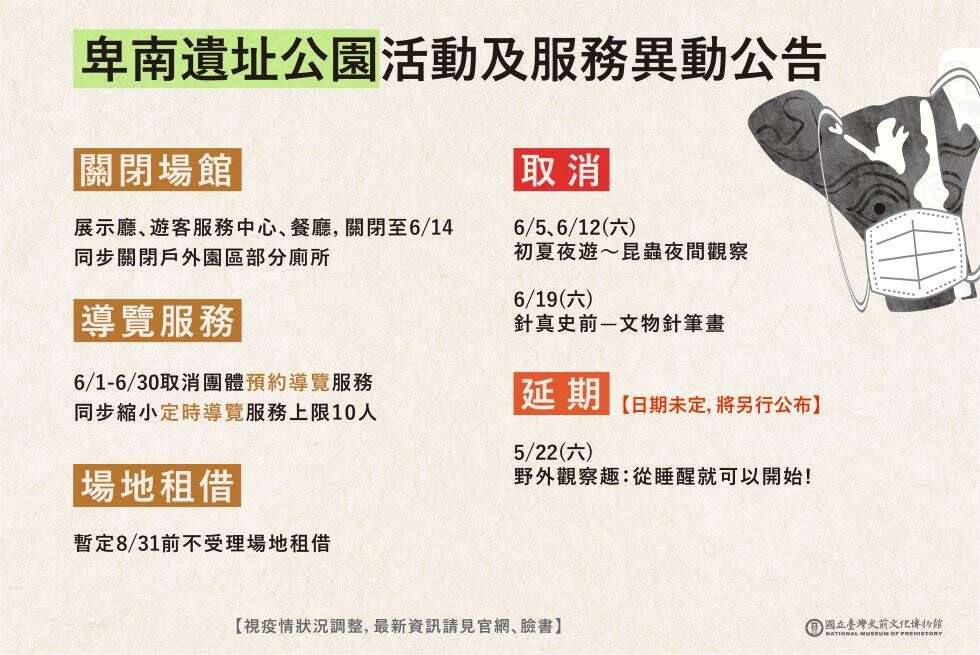 国立台湾史前文化博物馆(以下称史前馆)因应疫情升温,为防范人群及社区传播,卑南遗址公园配合台东县政府艺文场馆管制政策,自即日起关闭场馆及启动各项因应措施: