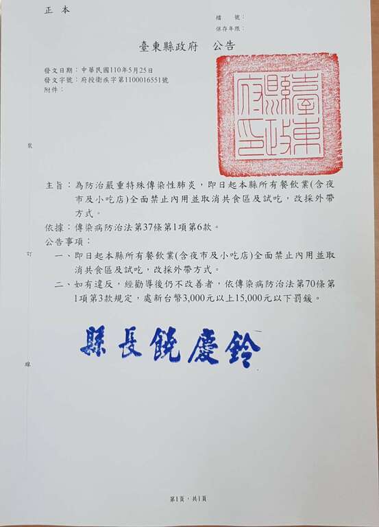 🍴即日起本县所有餐饮业(含夜市及小吃店)全面禁止内用,并取消共食区及试吃,改采外带方式。