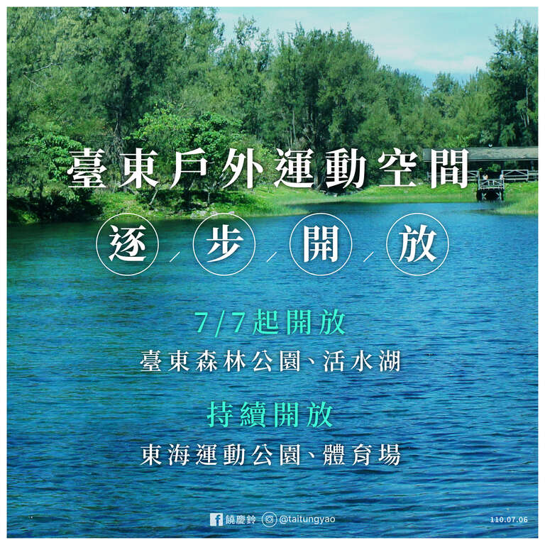 更新日期:2021-07-07發佈單位:台东县政府2491分享到FacebookTweet分享到微博LINE 给好友讯息内容 📢📢📢台东县政府宣布7/7起将逐步开放户外运动空间📢📢📢自7/7月起台东森林公园、活水湖,加上原本开放的体育场、东海运动公园场域,提供民众散步休闲的空间🏃♂ ⚠️仍依中央三级警戒规定,须请民众配合⚠️ 📍室内不得超过5人、室外不得超过10人聚会 📍必须全程戴口罩相关连结台东县县长饶庆铃FaceBook相关照片
