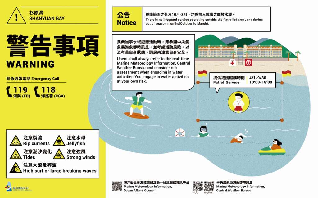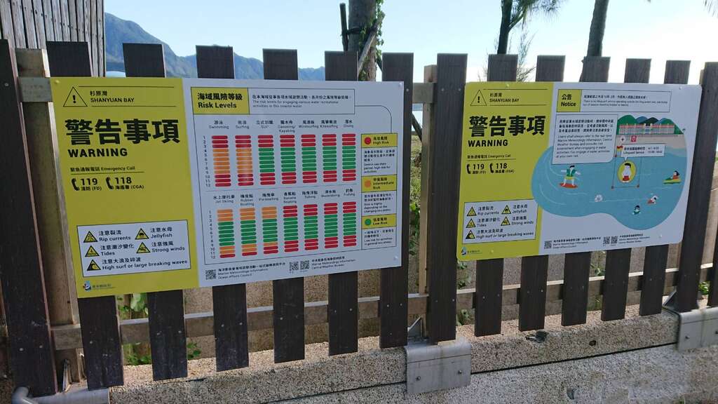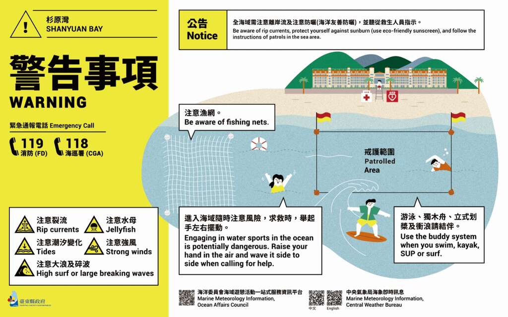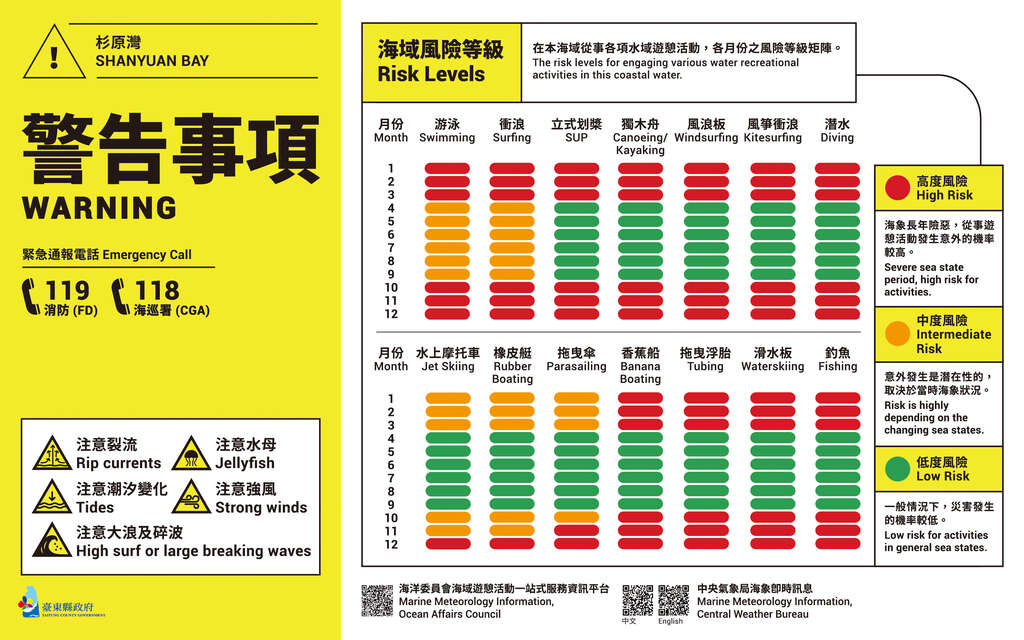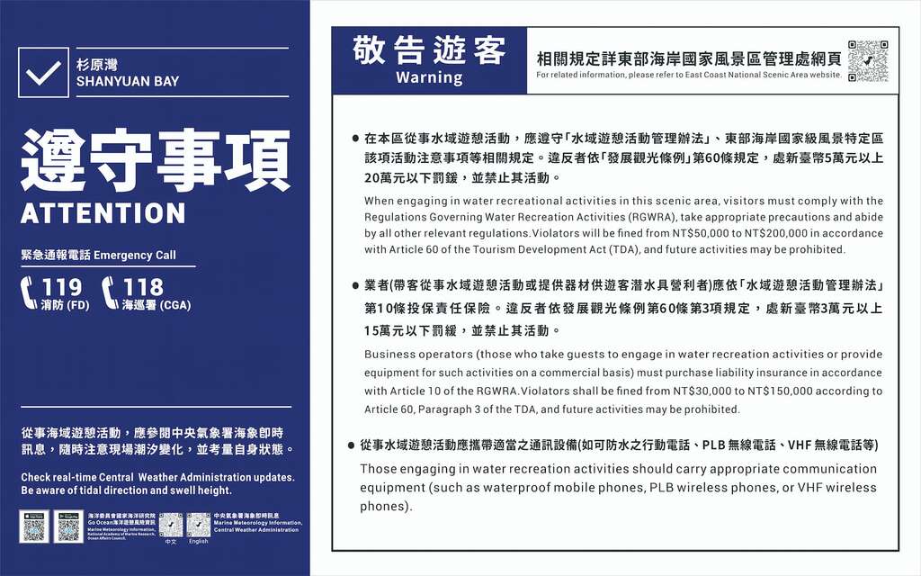 1.先看现场告示牌,扫描告示牌上QR CODE:了解现场环境、海域风险等级、即时海气象资