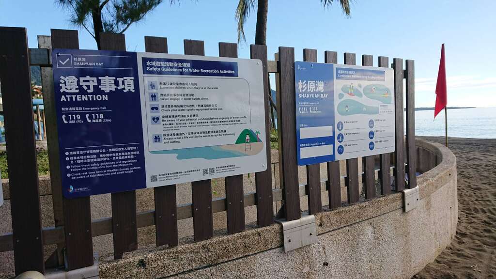 【告示牌】最快告诉你,甚麽要注意,紧急时,可以马上锁定如AED等救护资源位置(在杉原湾中间的了望台-巡逻员驻守位置就是救护站)!