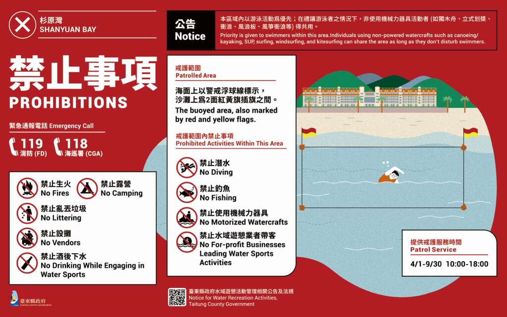 3.遵从现场巡逻员的管理:杉原湾於每年4/1-9/30 10:00-18:00提供巡逻员戒护服务,戒护