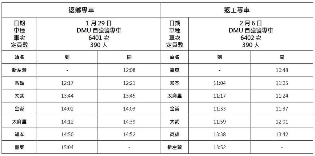 111年春节专车服务台铁将提供北回线(树林-台东)3列车次返乡及返工专车,返乡专车(树林-台东)为1月28日18:07普悠玛6178车次、1月29日08:50普悠玛6174车次、13:40普悠玛6176车次;返工专车(台东至树林)为2月5日12:33普悠玛6177车次、2月6日11:00普悠玛6179车次、12:33普悠玛6177车次。另台铁将提供南回线1列车次返乡及返工专车,返乡专车(新左营-台东)为1月29日12:08自强号6401车次;返工专车(台东至新左营)为2月6日10:48普悠玛6402车次。
