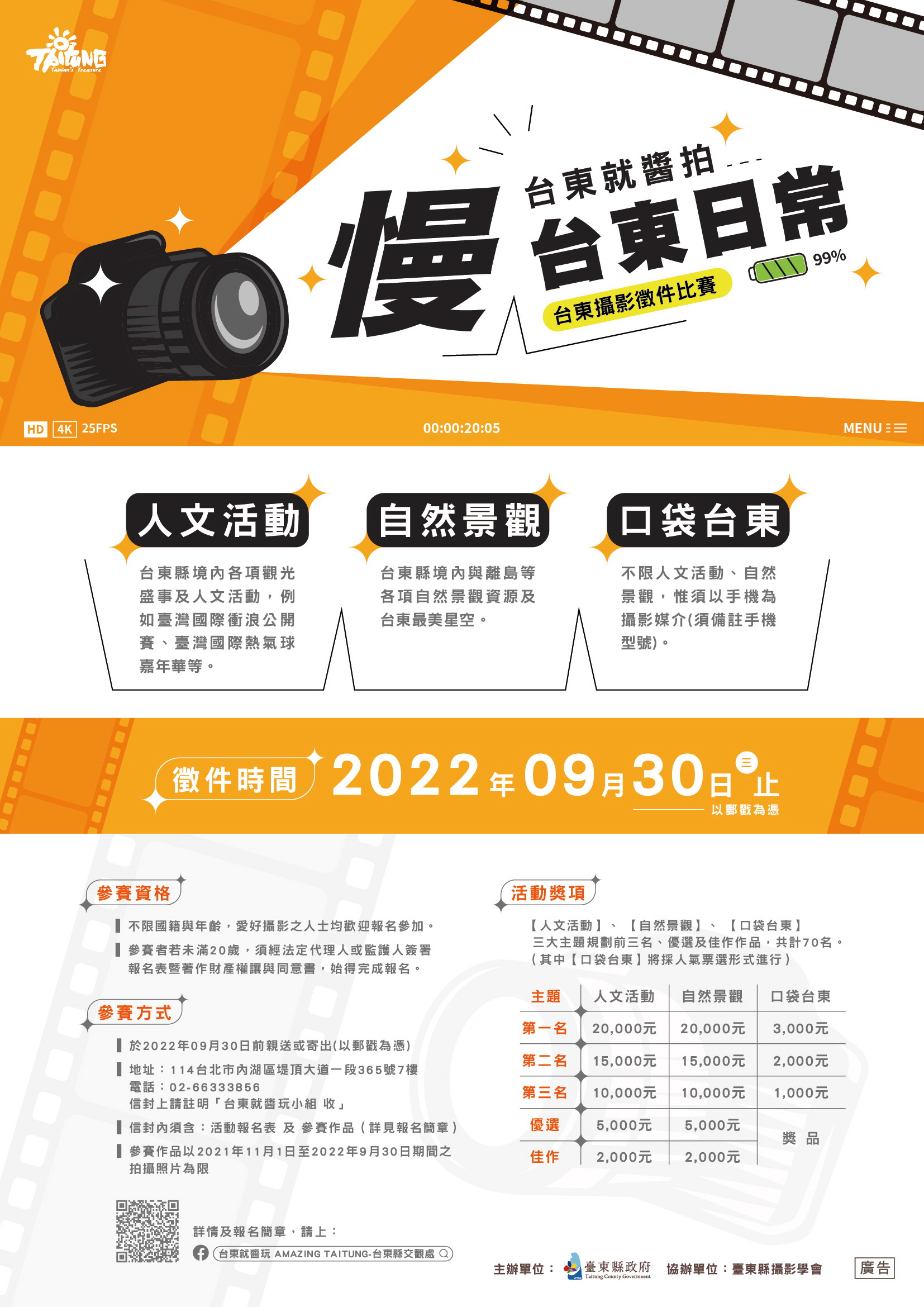 今年也特别规划「口袋台东」主题,鼓励民众以随手可得的摄影媒材,创造社群分享、互动美照,并将邀请全民共同参与票选,按照人气票选取前三名,提供第一名奖金新台币3千元、第二名2千元、第三名1千5百元,以及优选、佳作等共计10个入选名额。即日起至9月30日截止,以邮戳为凭,作品拍摄日期为2021年11月1日至2022年9月30日间皆可投稿。
