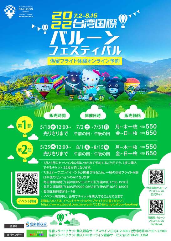 台东县政府表示,2022台湾国际热气球嘉年华「热气球系留体验」将提供上午场(5:30-7:30)与下午场(17:00-19:00)两个时段,球迷可於现场购票或线上预约方式,线上预约将委托易游网系统贩售,分两阶段开放民众预购。第一阶段於5月18日(三)中午12点开放预约7月2至7月31日场次,因7月2日配合开幕活动,仅供下午场预约。第二阶段则於5月25日(三)中午12点开放预约8月1日至8月15日场次。票价部分,周一至周四平日为550元,周五至周日以及国定假日则为650元。今年总计有89个场次,共7,120位名额,每张体验券为单人单场使用,若无法在线上购票的游客,主办单位也保留有现场购票的机会。