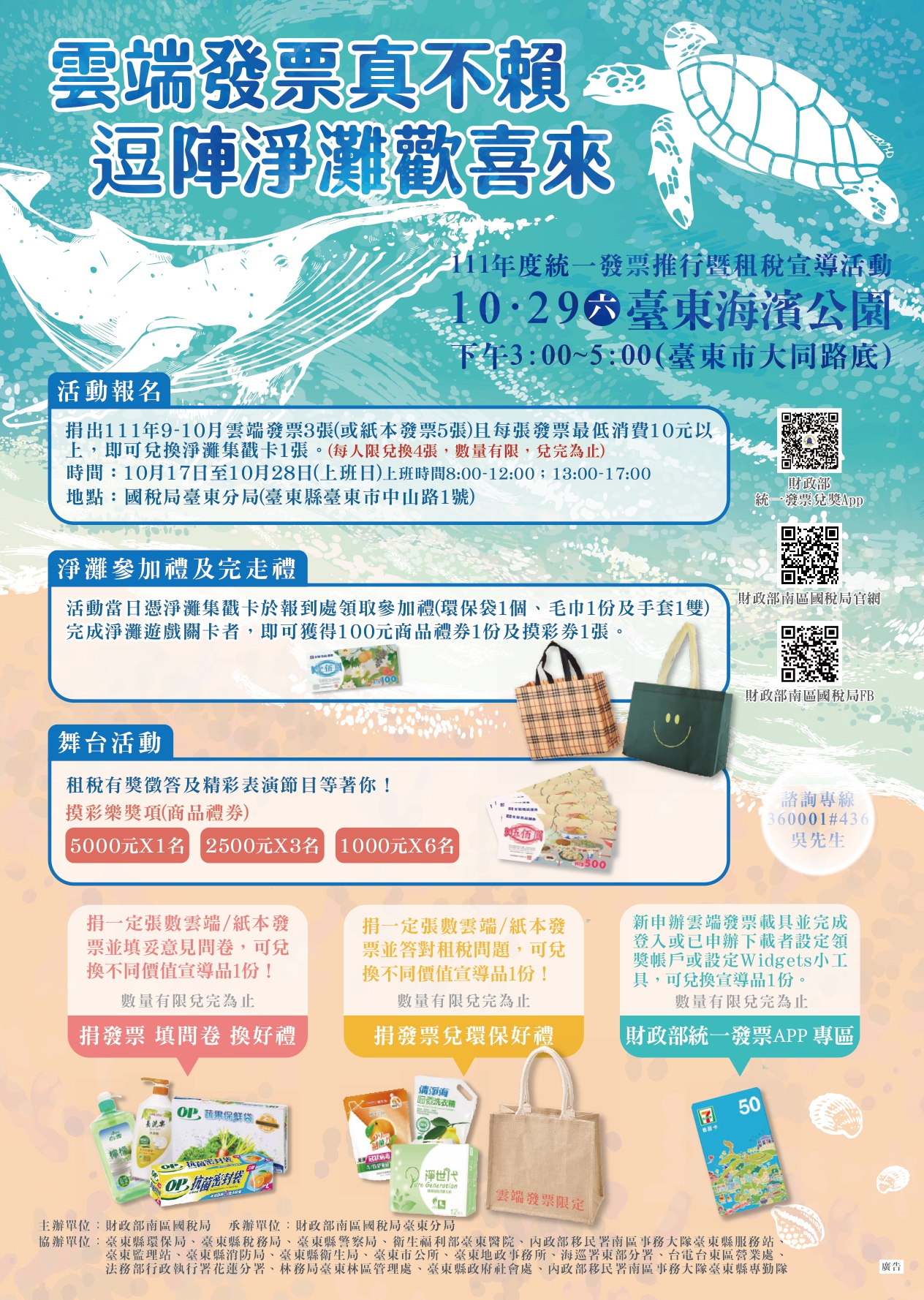 更新日期:2022-10-14發佈單位:台东县政府2439分享到FacebookTweet分享到微博LINE 给好友 讯息内容 国税局台东分局於111年10月29日台东市大同路海滨公园举办「云端发票真不赖 逗阵净滩欢喜来」统一发票租税宣导活动,欢迎共襄盛举 「云端发票真不赖 逗阵净滩欢喜来」租税宣导活动 活动时间:111年10月29日(星期六)15时至17时 活动地点:台东市大同路底海滨公园。 <资讯来源:财政部南区国税局台东分局> 文档下载「云端发票真不赖 逗阵净滩欢喜来」租税宣导活动(.jpg)