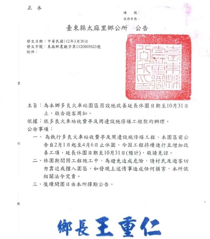 太麻里乡公所为执行多良火车站收费亭及周边设施修缮工程,原订於4月6日止休园,因工程持续进行且增加改善工项,延长休园日期至10月31日(预计)。
