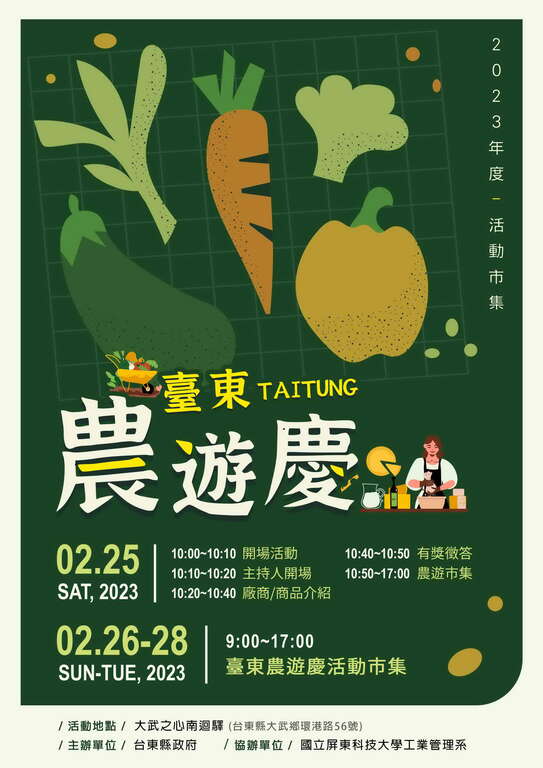为活络台东特色农游商家发展,行销南回地区观光及农特产品,台东县政府委托国立屏东科技大学於2月25至28日连续4天在号称全国最美的休息站「大武之心南回驿」,举行「2023台东农游庆」台东特色农游推动计画,特别挑选优质在地农特产业者及相关厂商一同参与,包括推广活动、特卖会及手作DIY等,县长饶庆铃邀请全国乡亲共来体验,让消费者看见台东在地优质农产品,使台东农产能永续发展。