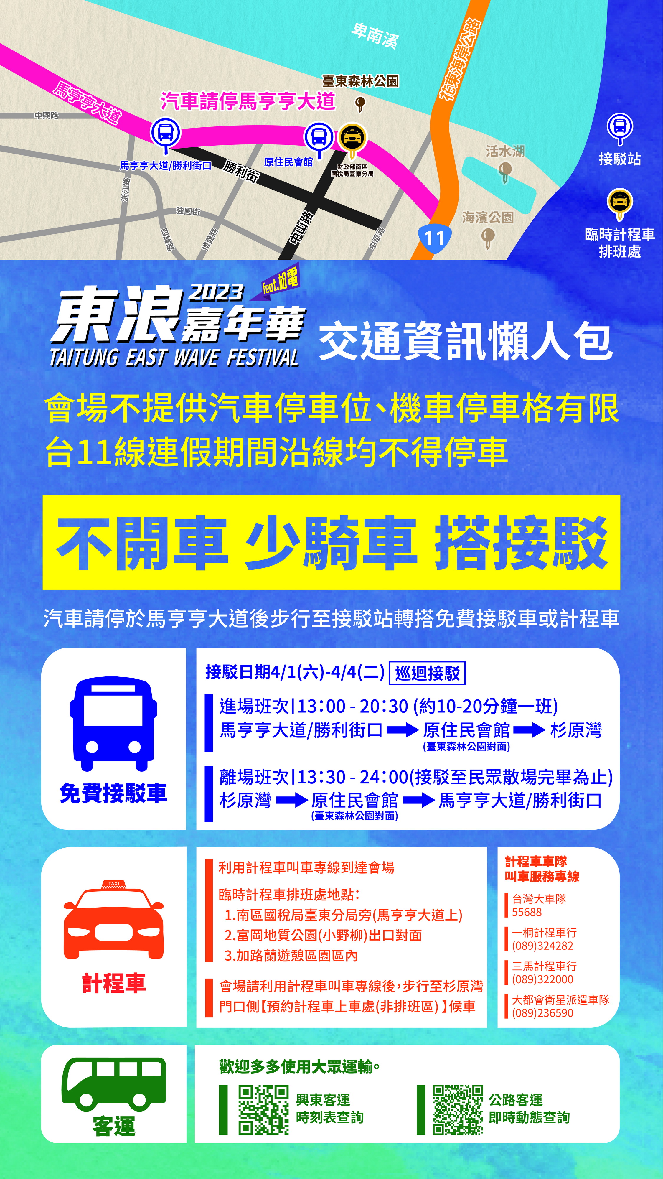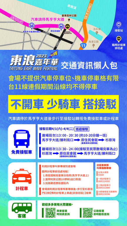 活动因逢连假,恐车流壅塞,为维护台11线交通顺畅,公路总局特别严禁台11线路边停车,建议请开车前来的朋友停至大会指定停车区,转搭免费接驳车。