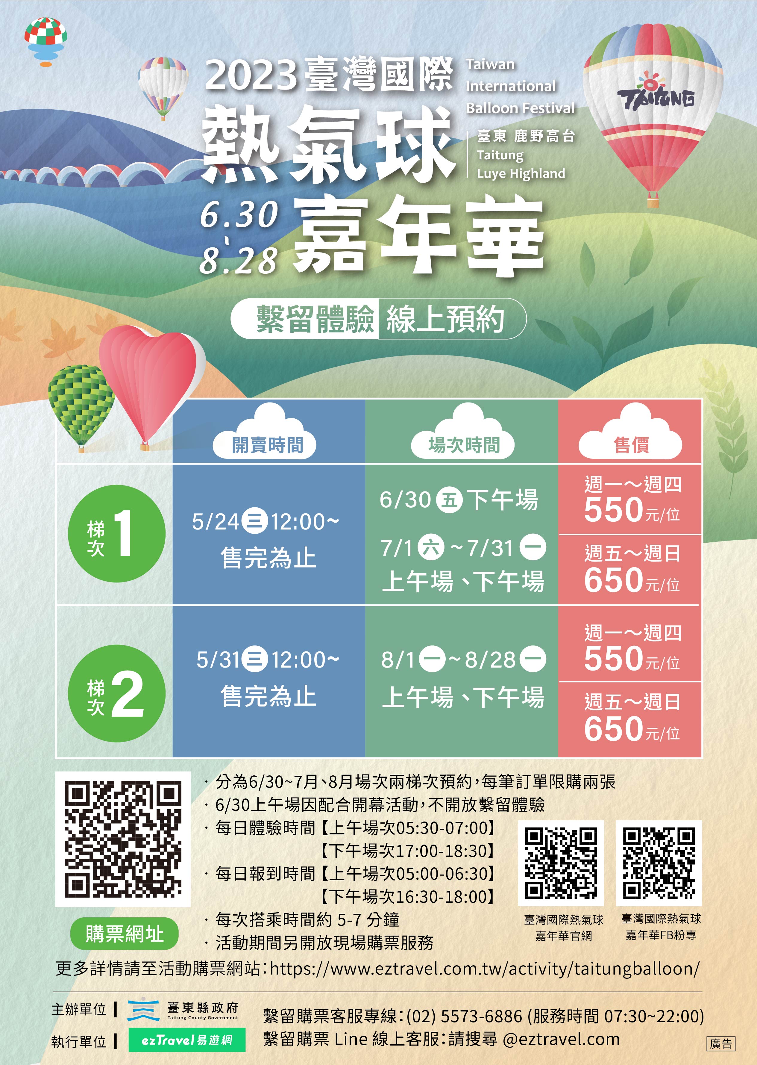 每年最受旅客期待的夏季盛事「台湾国际热气球嘉年华」,即将於6月30日至8月28日在台东县鹿野乡鹿野高台盛大展开!不仅活动长达60天为近年最长,更将创下全球最大热气球与无人机群飞的展演规模,还有全球唯一的「妈祖造型热气球」首发亮相,精彩可期的活动内容势必引爆追球热潮。除了观赏各式造型气球外,搭乘热气球享受升空快感的系留体验更是球迷们的必玩重点,台东县政府今(15)日宣布於5月24日与5月31日中午12点,分两阶段开放购票,每场次仅开放80位名额,想乘着热气球俯瞰鹿野大地美景球迷,欢迎在「2023台东慢游趣」线上预约平台准时上线抢订。