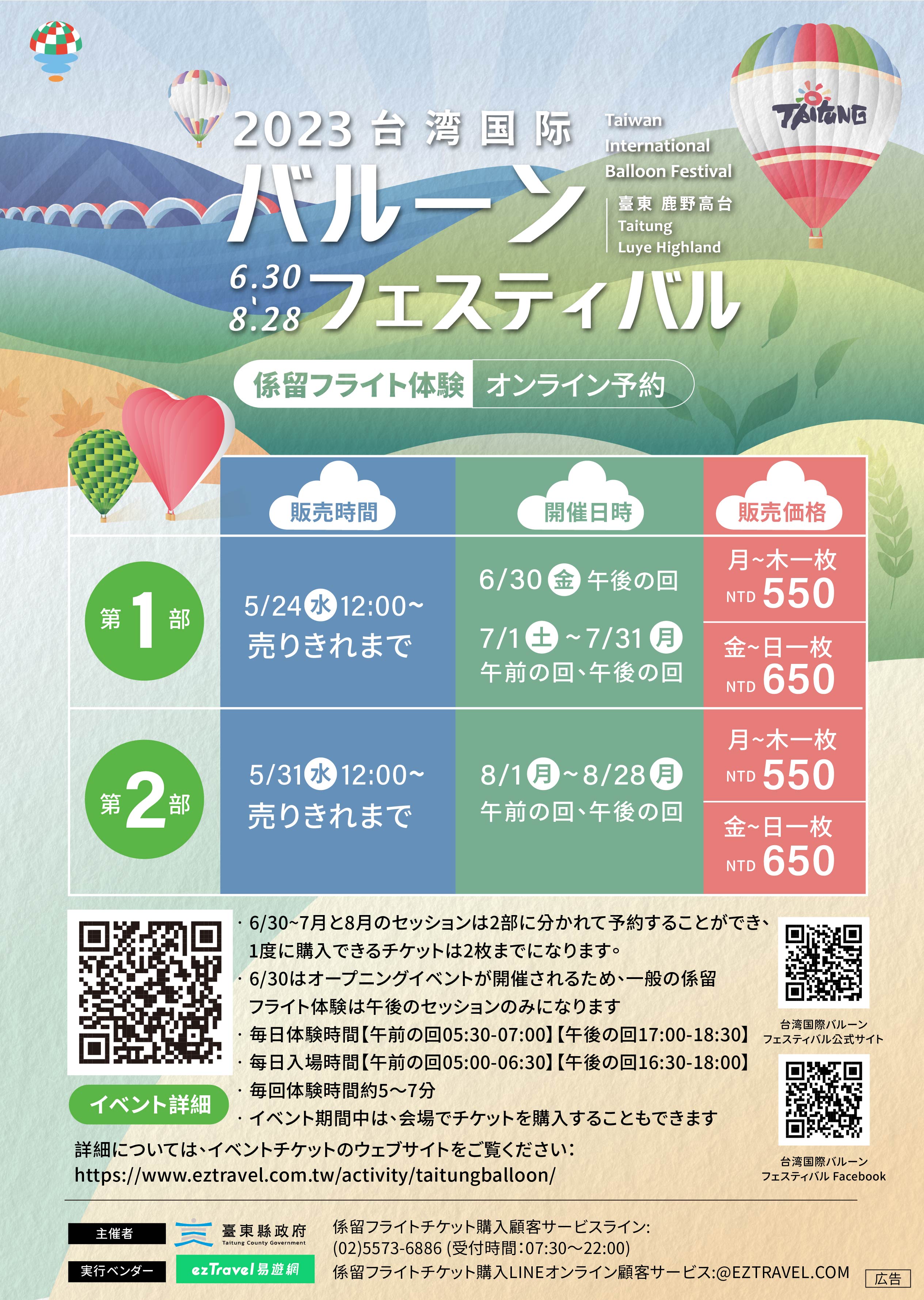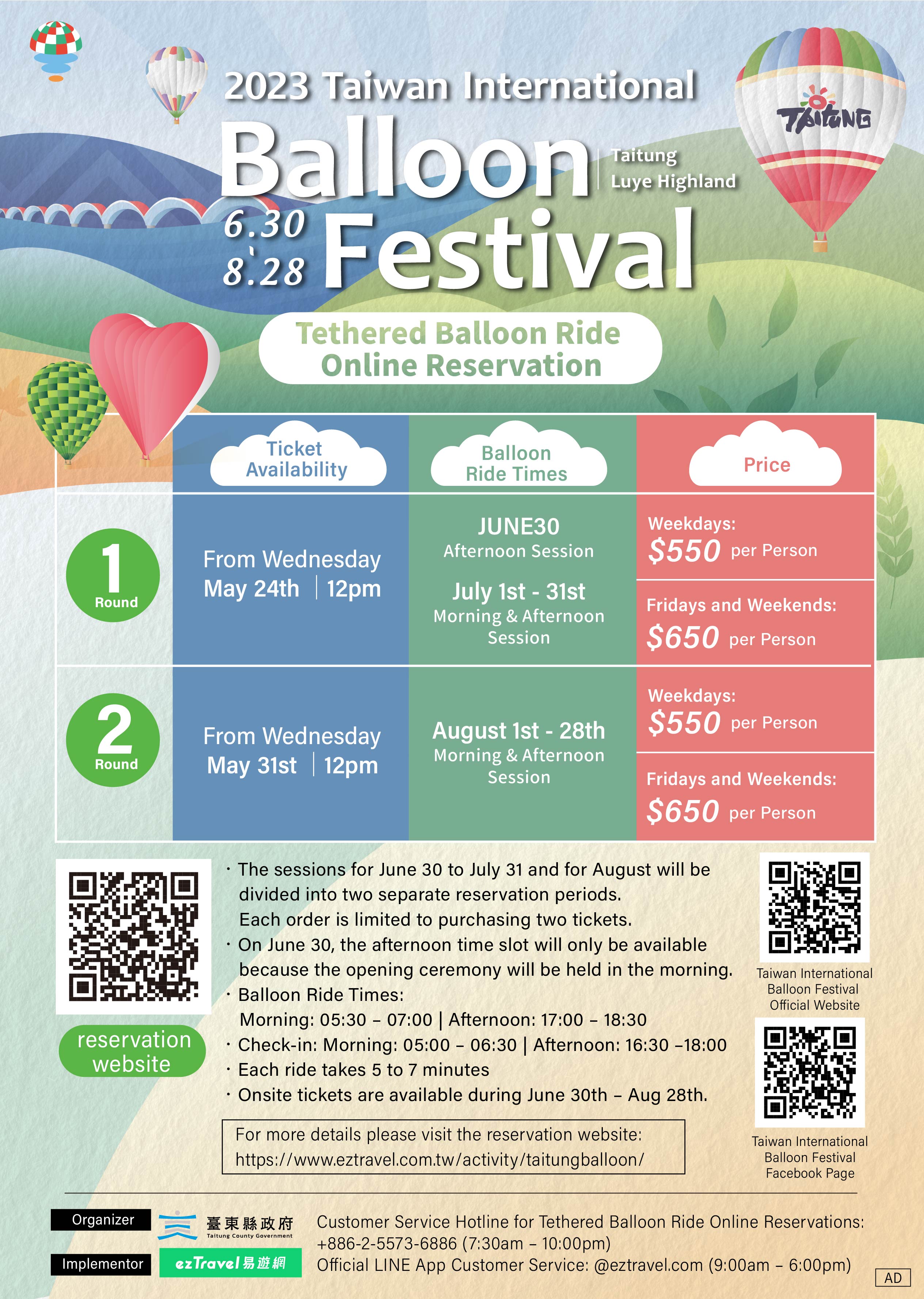 台东县政府指出,「热气球系留体验」於6月30日起至8月28日止,每日规划05:30-07:00上午场与17:00-18:30下午场两个场次(6月30日配合万球齐飞活动,仅提供下午场次),每场线上购票开放80位名额,并以搭乘月份分为两阶段进行预约。第一阶段於5月24日中午12点开放预约6、7月场次,第二阶段则於5月31日中午12点开放预约8月场次,总计119场,共9,520位名额,每张体验票为单人单场使用,每笔订单最多限购2张。票价部分,平日票(周一至周四)每张550元,假日票(周五至周日以及国定假日)每张为650元。