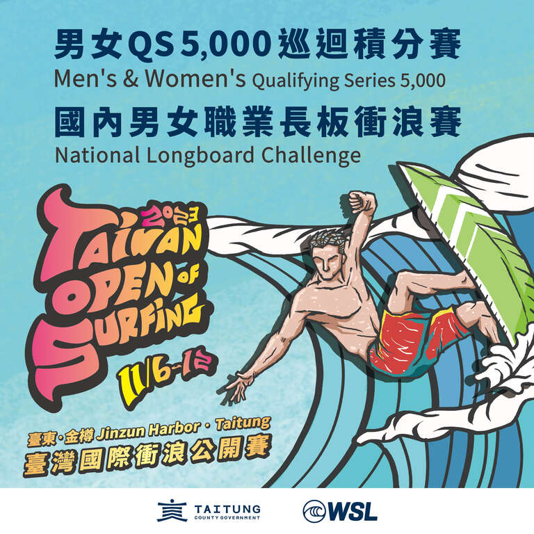 台东县政府表示,迈入第13年的台湾国际冲浪公开赛11月6日至12日将以国际顶级赛事男子/女子QS5,000再度激战金樽,今年台湾国际冲浪公开赛QS5,000高积分的资格赛更是 WSL 年度全球仅 8 场的最终场,许多国际顶尖选手将来台共同角逐高额积分,吸引日本、澳洲、纽西兰等多达10国选手将陆续前往台东参赛。