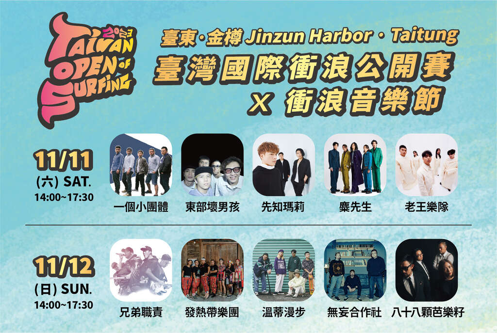 台湾最高等级的冲浪赛事-【台湾国际冲浪公开赛】即将於11月6日至12日於台东金樽举办,今年赛事更突破以往型态,除了以QS5,000 男/女子短板积分赛及国内职业男女长板赛打造更高规格层级赛事及以往民众最欢迎的【冲浪游乐园】之外,今年特别结合充满热力摇滚的【冲浪音乐节】,以超强卡司打造全台湾最嗨的冲浪赛事,11/11-12连续两天可以尽情沉浸在最嗨、最热情的冲浪摇滚音乐氛围中。