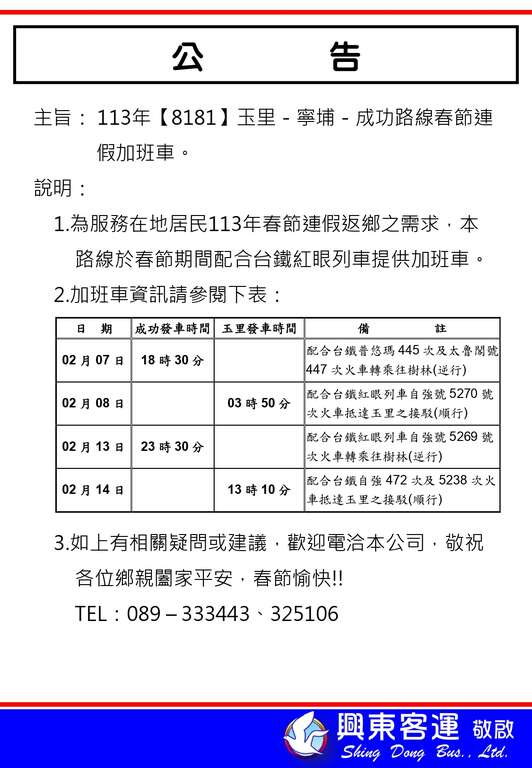 113 年农历春节「【8181】玉里-宁埔-成功(经玉长公路)」公路客运路线增开班次公告