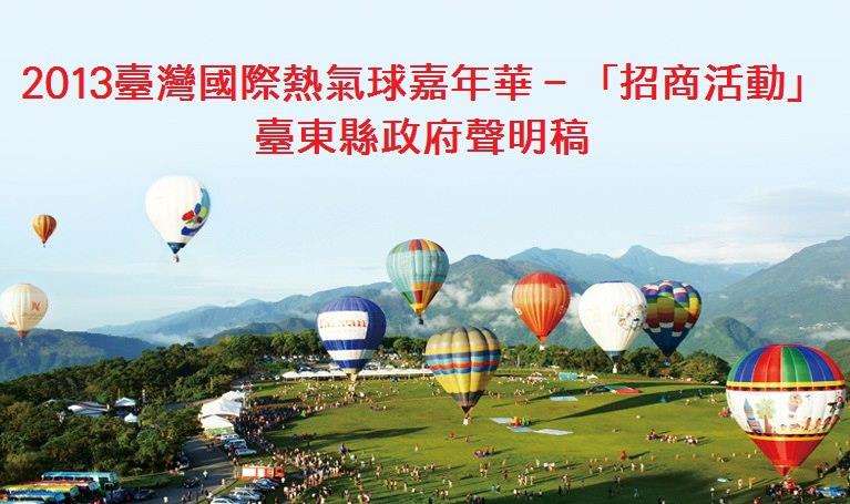 台东县政府主办2013台湾国际热气球嘉年华-「招商活动」,委托平实行销股份有限公司执行并仅於「鹿野高台」上设立摊位区,县府并未再与其他公司签约或同意於鹿野高台以外之场地设立任何摊位,为保障摊商权益,有关招商事宜一律以「2013台湾国际热气球嘉年华官方网站」上公布为主。如有任何相关问题请洽询台东县政府观光旅游处或平实行销股份有限公司。