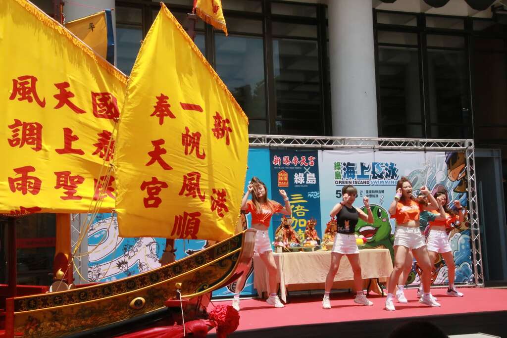 今天的绿岛长泳暨火烧岛马拉松记者会,迎来了开台妈祖号停驾县府一楼广场,由新港奉天宫董事长何达煌、台东天后宫董事长林有德、绿岛天后宫主任委员王益薪一起将妈祖请上开台妈祖号并由县长饶庆铃为其供花,透过开水路启航仪式,象徵着开台妈祖号即将启航绿岛。