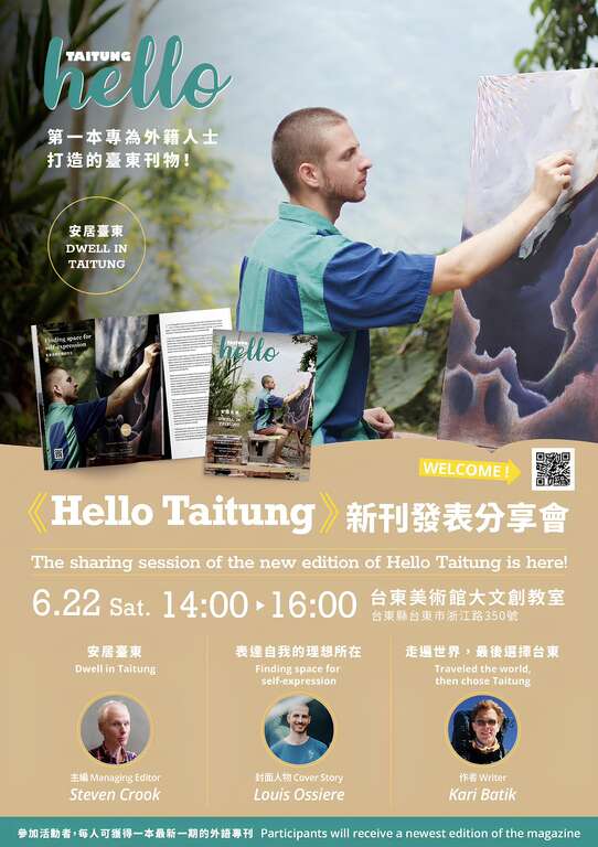 为了让在台湾的外籍人士能够更深度地了解台东的多元文化及生活,台东县政府创办了专为外籍人士量身打造的外语刊物《Hello Taitung》,一年发行两期,每期选择一个主题,邀请居住在台东的外籍朋友们,撰文分享在台东生活的真实样貌。新一期的主题为「Dwell in Taitung安居台东」,由几位在台东生活的外籍朋友经验中,我们看到了台东吸引他们安居的魅力,对他们来说台东是实现自我/抚养孩子/修复身心的绝佳所在!