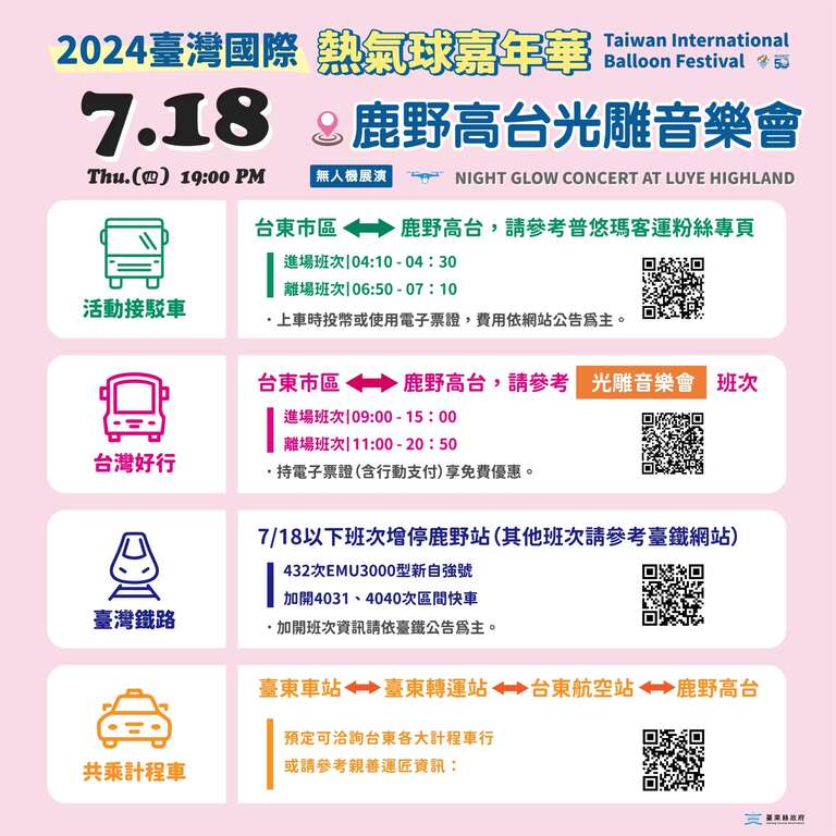 台东县政府特别提醒明晚前往热气球光雕音乐会的球迷朋友,不仅可从鹿野火车站、台东市区搭乘接驳车,及台湾好行纵谷鹿野线班次外,也可采用共乘计程车方式抵达;自行开车的民众,现场也有民间停车场与在地商家的消费购物停车场可使用,相关活动交通及停车资讯,欢迎民众多加利用,详情请洽2024台湾国际热气球嘉年华FB粉丝专页或官网查询。