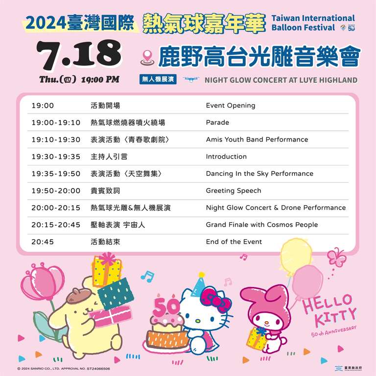 台东县政府表示,明晚热气球光雕音乐会,除了将由小王子与妈祖球领军之外,第二波来访的紫色小龙、科学怪人男孩、福斯巴士也将会全数参与热气球光雕音乐会,总数13颗造型球,会与三丽鸥知名家族角色「HELLO KITTY、布丁狗、美乐蒂、酷企鹅及大耳狗喜拿」共同与500架次无人机进行联合展演。