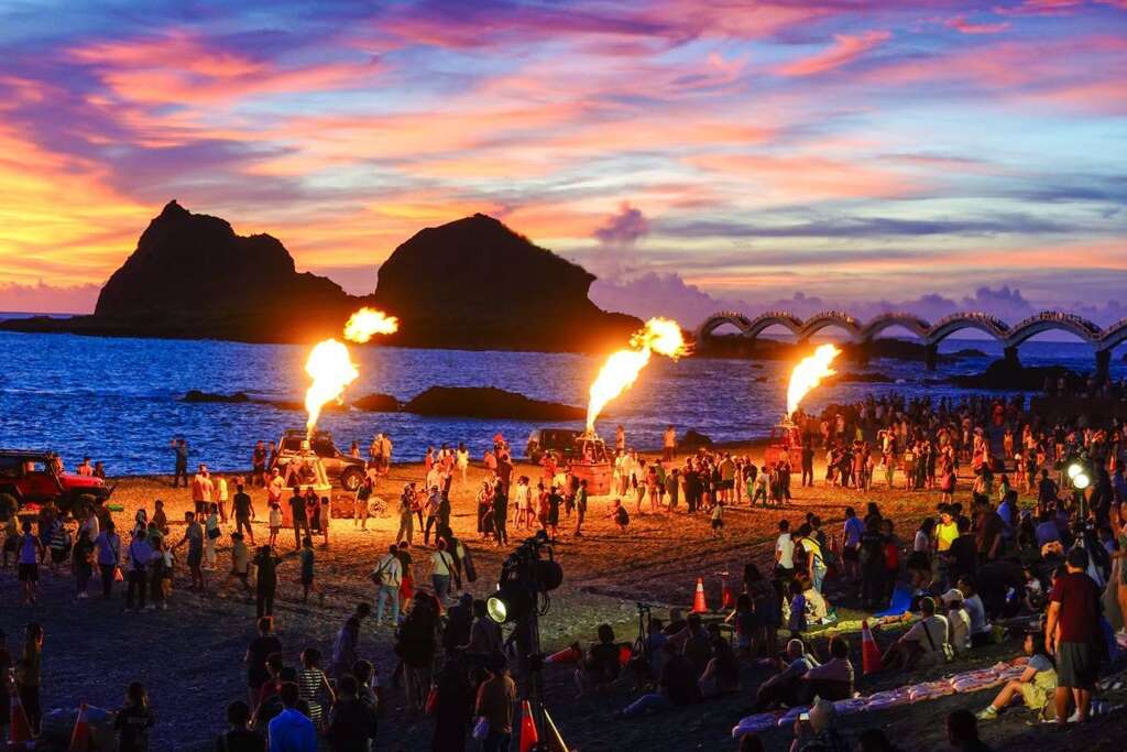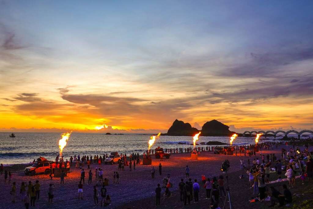 台东成功镇三仙台以自然景观及地质奇观闻名,当太阳从海平面升起,海天一色演绎着太平洋的极致壮丽,更是迎接曙光的绝佳景点,三仙台知名地标八拱跨海步桥更成为画龙点睛之笔,与日出时分冉冉升起的曙光相互辉映。光雕音乐以【勇气与曙光】为主题,由台东球领军熊赞球、彩虹球、曙光球及今年全新亮相的Coach勇气球带来表演,虽然因瞬间风势过大提早收球,不过现场加码开放近距离拍照体验,让每一位观众陶醉在音乐中享受三仙台的清晨时光,与曙光共同迎接崭新一天的到来。