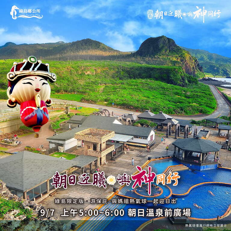空-『妈祖热气球』升空迎日出,由台东县政府打造的台东天后宫妈祖热气球首度莅临绿岛进行立球仪式,将於9月7日上午5点~6点,於绿岛朝日温泉户外广场陪同海内外游客与妈祖神尊们一起迎接绿岛最美第一道的曙光,绿岛乡公所欢迎全国妈祖信众及游客到绿岛感受海洋女神庇佑,创造陆海海空疯妈祖的特色之旅。另外还有绿岛海洋嘉年华.祈福遶境活动、艺阵展演.平安宴活动等,在夏末秋初的宜人海风里,带着妈祖的祝福,在绿岛给自己来一场洗涤身心灵的旅程。