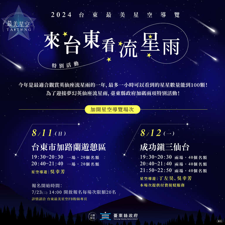 台东县政府交通及观光发展处表示,为迎接英仙座流星雨极大期,台东最美星空首次加开深夜场,并首度以双导游形式办理,预计於8月11日加路兰游憩区举办2时段(19:30~20:30及20:40~21:40)导览,12日则配合流星雨极大期於三仙台加开3个时段(19:30~20:30、20:40~21:40、21:50~22:50)各两场次,两日至少可服务200人参与观看台东最美星空。