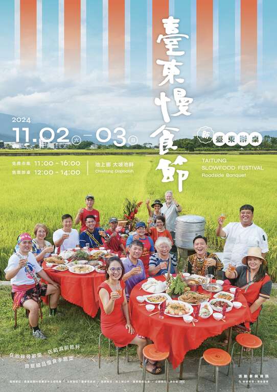 2024年台东慢食节秋天场,将於11月2、3日(六、日)在池上乡大坡池举办,活动主题为「新.台东办桌」,将以慢食精神重新诠释传统办桌料理,邀请各地喜爱慢食节的朋友,迎着黄金稻浪,在大坡池畔齐聚,细品慢食手路菜,感受全新的慢食节!