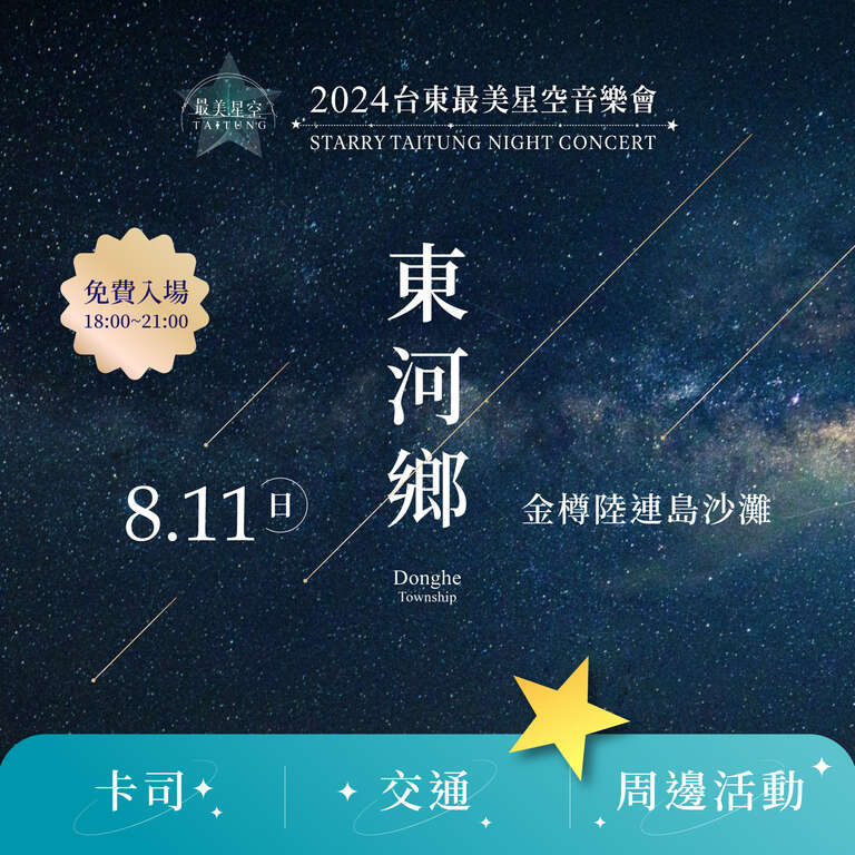 台东最美星空音乐会在八月尚有二场次,分别为8月24日在兰屿乡椰油国小及31日在绿岛乡公馆国小,将由黄玠玮、李浩玮Howard Lee、芒果酱Mango Jump、晨悠CHENYO、徐暐翔等多组人气歌手、乐团等轮番演出,带来不同的音乐氛围,欢迎民众多加利用暑假,到台东感受精彩的夏日盛宴。更多活动最新消息请见官方FB或官方IG。