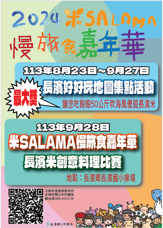 台东县长滨乡公所为推动在地观光及产业发展,於113年8月份起举办「2024米SALAMA!长滨慢旅食嘉年华」系列活动,其中包含113年8月23日起开跑的「2024米SALAMA!好好玩地图」长滨乡地图集点活动,以及113年9月28日假台东县长滨国民小学盛大举办的「米SALAMA!长滨慢旅食嘉年华」、「米SALAMA!长滨米创意料理比赛」等,邀请民众一起来长滨乡体验不同的慢旅食生活。