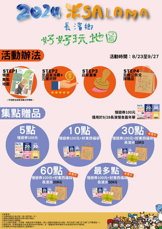 长滨乡公所表示,长滨乡被喻为最难到达的乡镇,因此为让更多民众认识「长滨乡」,本次邀请乡内小农、在地餐厅及旅宿业者一起串联,从「米SALAMA!好好玩地图」活动出发,为期一个月的店家集点活动,让民众跟着地图一路玩到底,最後并於活动尾声113年9月28日(星期六)举办大型嘉年华活动,为活动画下完美句点。
