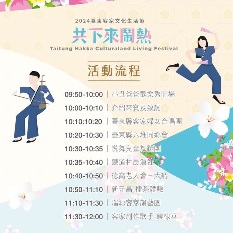为了让民众认识客家文化,台东县政府特与台东市公所合作推广客家音乐及戏剧,订於9月21日(六)於台东客家学堂办理「台东客家文化生活节-共下来閙热」活动,增进客家人对於自身文化身份和价值观的认同,培养新世代对传统文化的认识与认同,看见客家艺术的美,丰富的感官体验,欢迎民众一起来欢喜斗闹热。